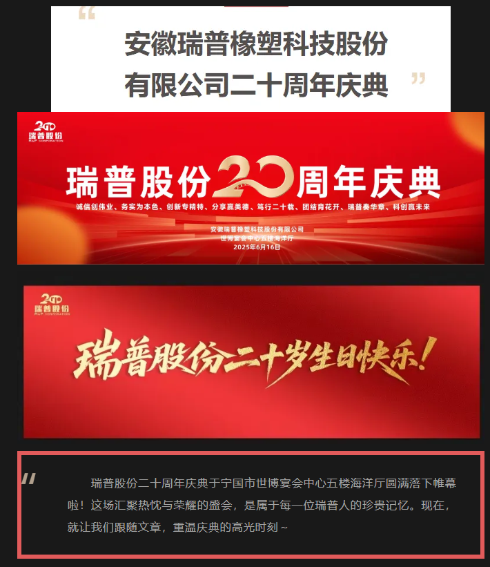 二十載櫛風(fēng)沐雨,二十載砥礪前行。值此安徽瑞普橡塑科技股份有限公司成立二十周年之際,我們滿懷感恩與喜悅,誠(chéng)邀您撥冗出席二十周年慶典活動(dòng),共同見證這一榮耀時(shí)刻,共敘情誼,共謀未來(lái)!